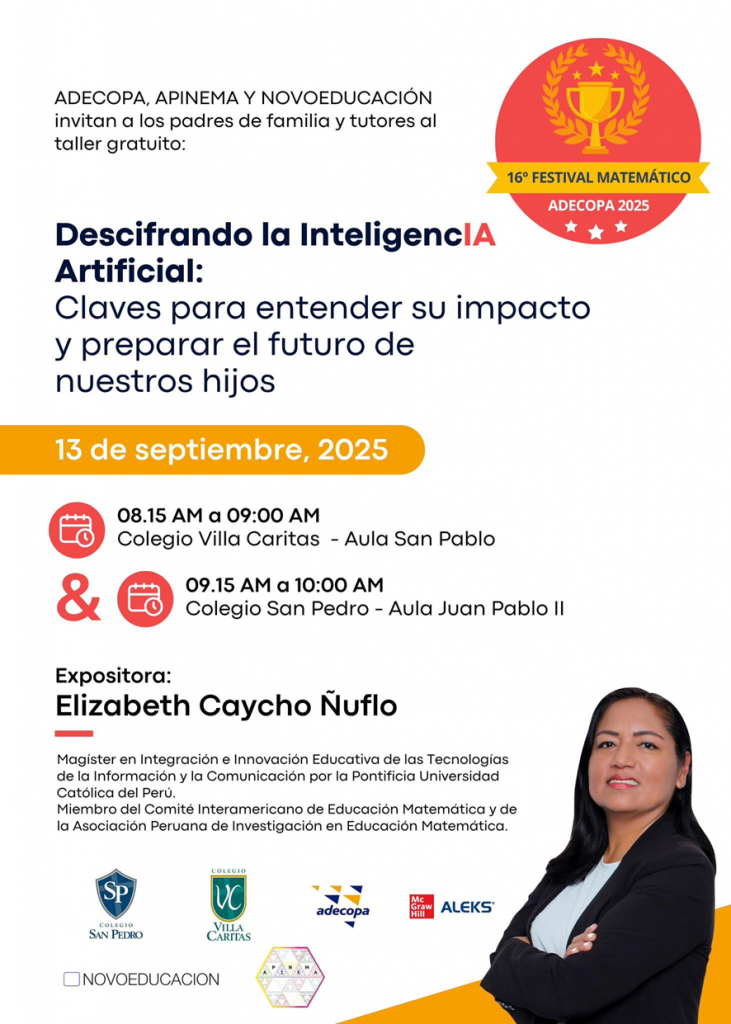 El 13 de septiembre del 2025 la Mg Elizabeth Caycho Ñuflo, miembro de la Asociación Peruana de Investigación en Educación Matemática (APINEMA), fue la encargada de brindar el taller “Descifrando la Inteligencia Artificial: Claves para entender su impacto y preparar el futuro de nuestros hijos presentar la conferencia” en el colegio Villa Caritas.