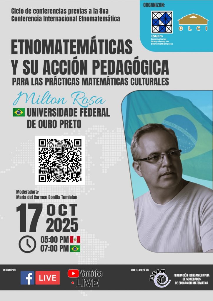 En esta oportunidad, el Dr. Milton Rosa de la Universidade Federal de Ouro Preto expondrá la conferencia titulada “Etnomatemáticas y su acción pedagógica para las prácticas matemáticas culturales” el 17 de octubre a las 5 pm hora de Perú. Milton Rosa considera que las etnomatemáticas estudian los factores sociales y culturales que afectan la enseñanza y el aprendizaje de las matemáticas en contextos escolares y extraescolares en diversos ambientes sociales, económicos, políticos y multiculturales. Sofisticadas ideas y prácticas matemáticas, que incluyen principios geométricos en trabajo artesanal, conceptos arquitectónicos y prácticas, son encontrados en actividades y artefactos de muchas culturas locales. Las etnomatemáticas pueden ser consideradas como el estudio de las ideas y prácticas matemáticas, que considera el contexto cultural en el cual las matemáticas emergen y que pueden ser consideradas en las acciones pedagógicas de las etnomatemáticas.
